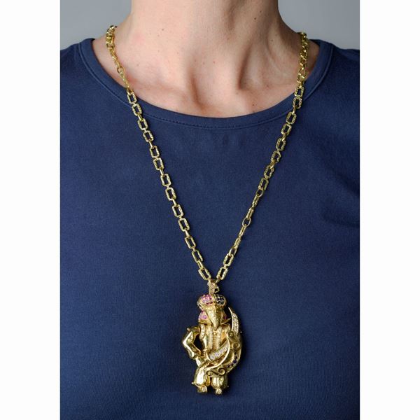 Grande pendente snodabile Saraceno in oro giallo, zaffiri, rubini e diamanti, firmata Moroni