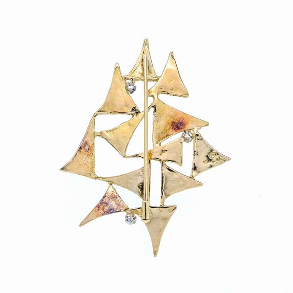 Grande spilla di ispirazione geometrica in oro giallo e diamanti, firamta Quaglia