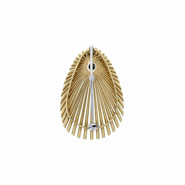 cm 2.7 x 3.9DESCRIZIONE: spilla realizzata come una conchiglia stilizzata formata da segmenti in oro ed impreziosita da un elemento ovale decorato in pavè di diamanti taglio huit-huit, reca il marchio 750 PESO: g 12.0