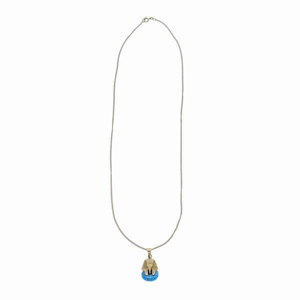 pendnete cm 1.5 x 3 hDESCRIZIONE: pendente realizzato come testa di Faraone in oro giallo e smalto turchese, corredato di catena con maglie intrecciate, questa ultima reca il marchio 750 PESO: gr 6.8