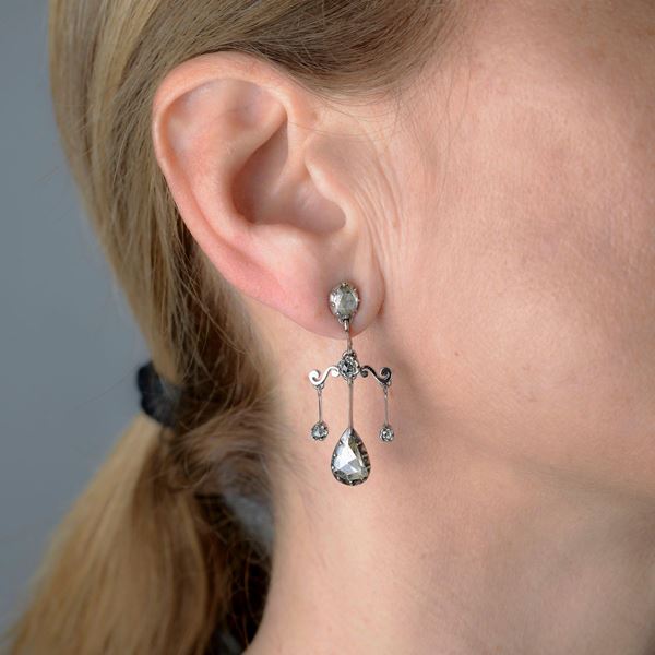 h cm 3.7DESCRIZIONE: paio di orecchini pendenti, ciascuno realizzato con clip con diamante taglio rosa coronè e due pendenti laterali ciascuno con piccola rosa coronè nella parte finale, parte centrale con lunga barretta con diamante taglio goccia pendente PESO: diamanti ct 2.0, (i due taglio goccia sono di ct 0.60 l'uno circa) gr 9.6
