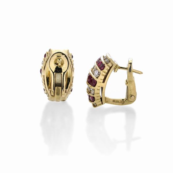 cm 1 x 1.4 hDESCRIZIONE: paio di piccoli orecchini, leggermente bombati, ciascuno impreziosito con linee di rubini alternate a linee di diamanti, recano il marchio 750 PESO: gr 6.5