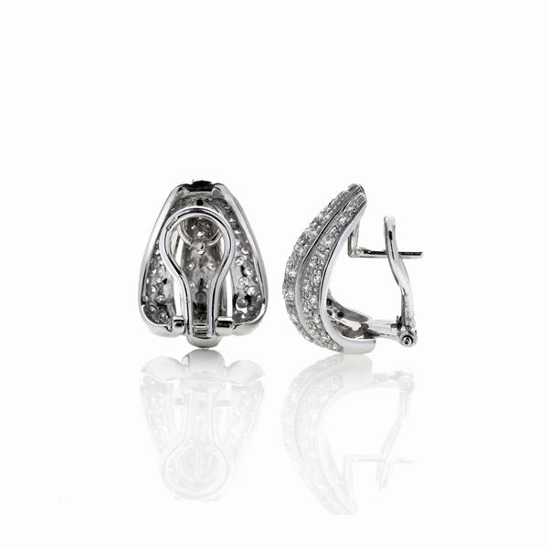 cm 1.5 x1.6 hDESCRIZIONE: paio di orecchini, ciascuno realizzato come una foglia stilizzata e baccellata, leggermente bombata e interamente impreziosita con pavè di diamanti, recano il marchio 750 PESO. gr 11.7