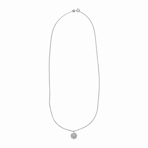 catena aperta cm 42, diametro corolla mm 9DESCRIZIONE: pendente realizzato come un fiore interamente impreziosito con diamanti taglio brillante, corredato di catena a maglie, quest'ultima reca il marchio 750 PESO: diamanti ct 0.60 circa, gr 3.5