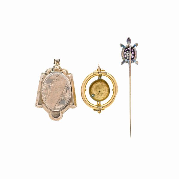 pendente portaritratto cm 2.9 x 5; pendente cm 2.6 x 3.2; tartaruga cm 1.3 x 2.2, lunghezza cm 7.2DESCRIZIONE: Pendente porta ritratto realizzato come uno scudo con ferro di cavallo e piccoli turchesi, apribile nella parte posteriore, pendente circolare centrato da piccola stella e spilla da cravatta realisticamente modellata come una tartaruga interamente impreziosita con rubini e microperle PESO: gr 12.9