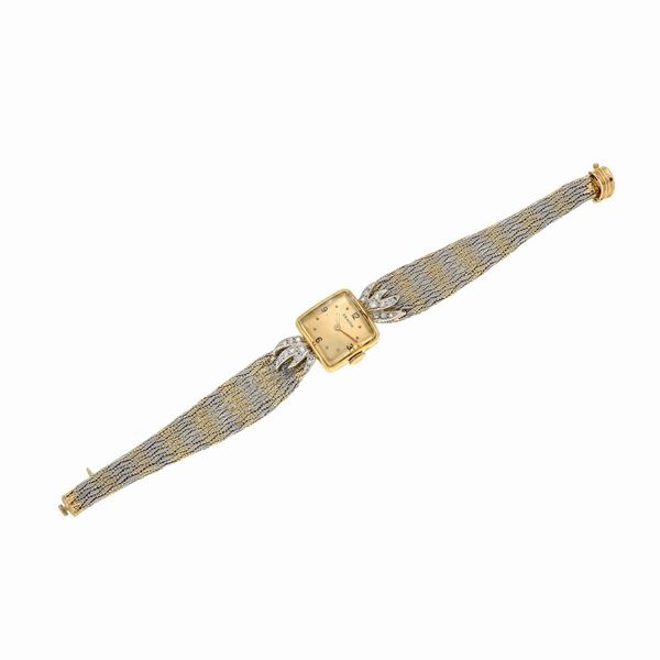 aperta cm 43.5, cassa mm 18 x 18DESCRIZIONE: cassa carrè con quadrante oro con numeri arabi ed indici puntiformi, le anse, saldate alla cassa e al bracciale, realizzate a forma di foglie in oro bianco e diamanti, il bracciale sagomato realizzato a maglia tessuto a motivi romboidali in oro bianco ed oro oro giallo, chiusura a semi-anello inciso a righe, completo di catenella di sicurezza, movimento a carica manuale marcato Zenith, punzoni 750 PESO: gr 37.8