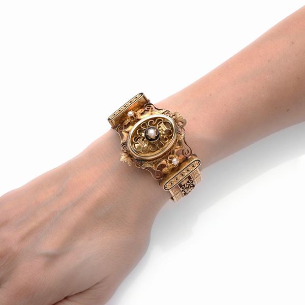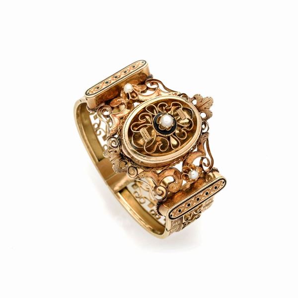 chiuso diametro interno cm 5.5DESCRIZIONE: bracciale ad alta fascia riccamente traforata e cesellata a volute, nella parte centrale è inserito un medaglione porta-ricordi di forma ovale con coperchio analogamente lavorato ed impreziosito da perla e smalto nero, affiancato da grandi volute fogliacee e corolle decorate con perle e da due segmenti decorati a cesello e smalto nero, punzone francese dell'oro PESO: g 47
