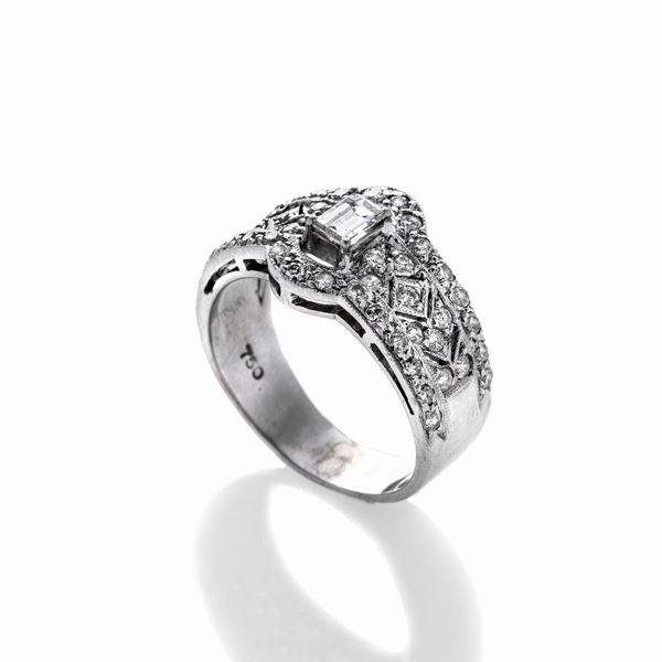 misura 10DESCRIZIONE: anello realizzato a fascia traforata a motivi geometrici impreziosita da diamanti taglio huit-huit, al centro un diamante taglio baguette montato entro castone ovale traforato, reca marchio 750 PESO: diamante taglio baguette ct 0.10, gr 4.3