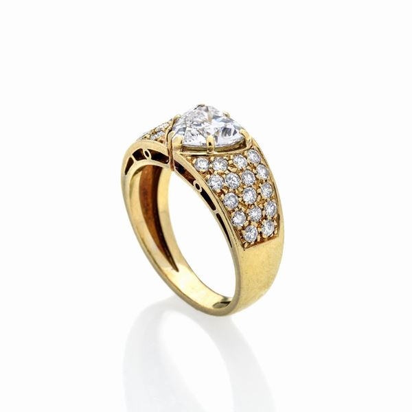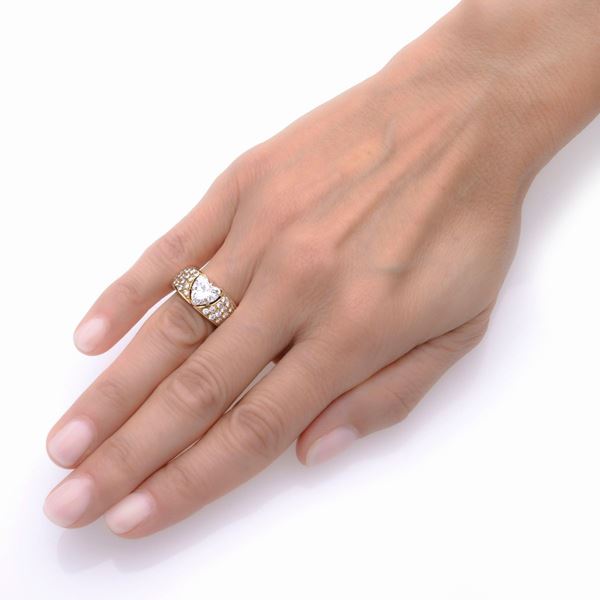 Anello a fascia in oro giallo, diamanti e diamante taglio a cuore