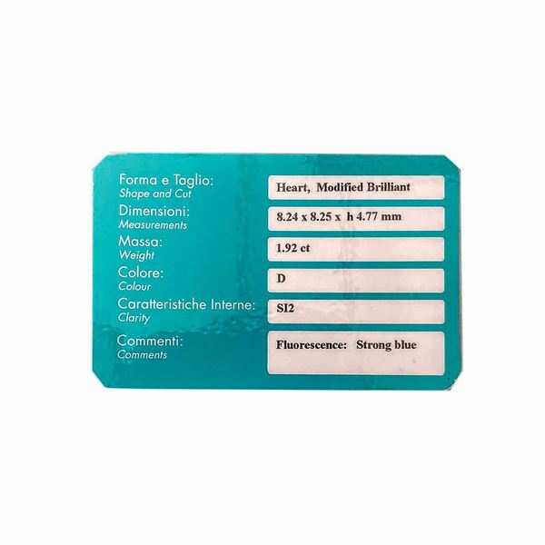 misura 17DESCRIZIONE: anello a fascia realizzato con diamante taglio a cuore incorniciato con pavè di diamanti sulla fascia e sui lati PESO: diamante taglio cuore ct 1.92, purezza SI2, colore D, fluo forte, corredato di certificato RAG num. DV22129 del 14.10.2022, diamanti taglio brillante ct 1.0 complessivamente, purezza VVS-VS, colore H, gr 6.7