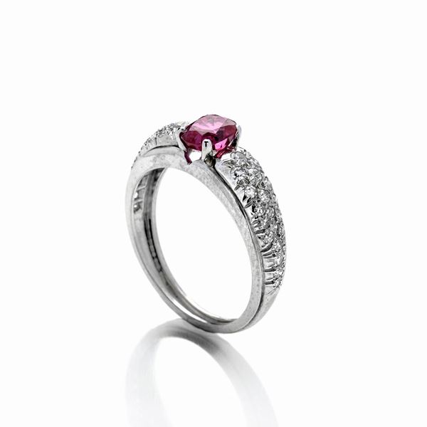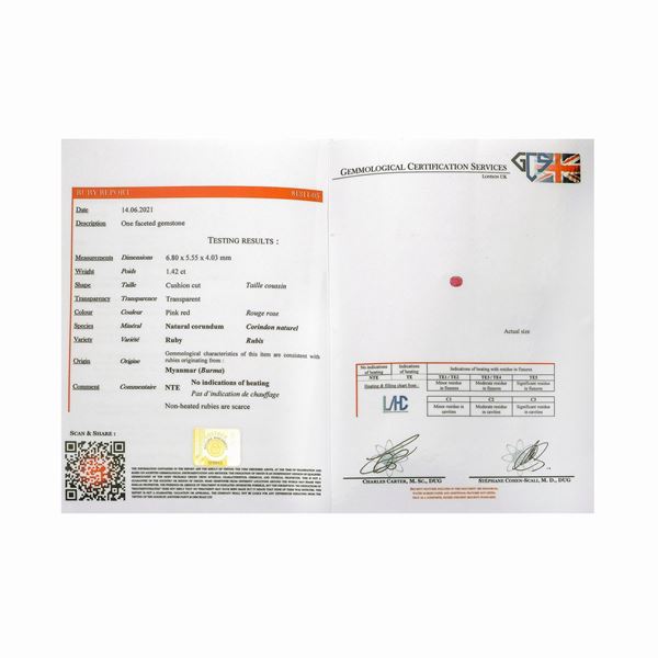 misura 21DESCRIZIONE: anello a fascia bombata impreziosita da un pavè di diamanti huit-huit e centrata da un rubino di taglio ovale PESO: gr 6, diamanti ct 0.40 circa, rubino di ct 1.42 corredato da certificato gemmologico n. 81311-05 rilasciato da Gemmological Certification Services in data 14/6/2021 che attesta che il rubino, di provenienza Myanmar (Burma), non presenta alcuna traccia di riscaldamento