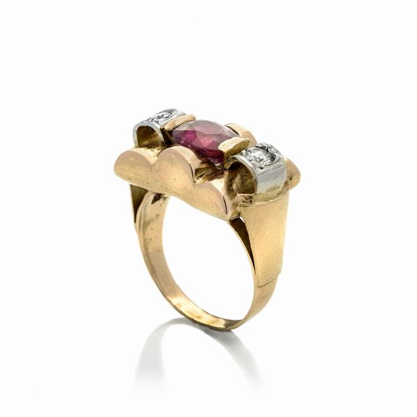 anello 15DESCRIZIONE: anello a fascia di forma rettangolare sagomata decorato da un rubino taglio ovale affiancato da due diamanti taglio vecchio, reca punzone 750 PESO: diamanti ct 0.30, g 5.8