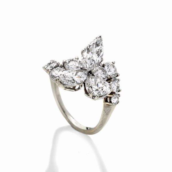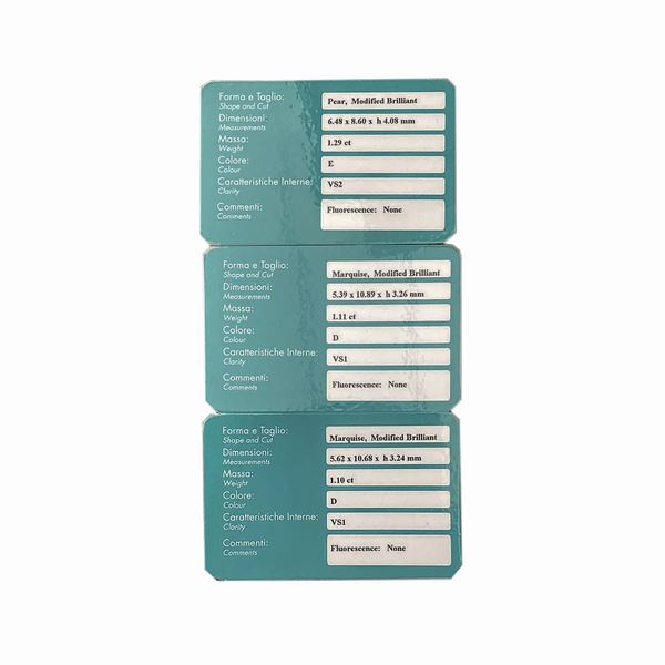 misura 14DESCRIZIONE: anello fantasia realizzato con due diamanti taglio marquise ed uno a goccia, impreziositi con diamanti taglio brillante disposti sulla fascia PESO: diamante taglio marquise ct 1,10, VS1, colore D, non fluo, corredato di certificato RAG DV22126 del 14.10.2022, diamante taglio marquise ct 1,11, VS1, colore D, non fluo, corredato di certificato RAG num. DV22127 del 14.10.2022, diamante taglio goccia ct 1,29, VS2, colore E, non fluo, corredato di certificato RAG nu. DV22128 del 14.10.2022, diamanti taglio brillante ct 2.20 complessivamente, VS1, colore F-G, gr 6.2