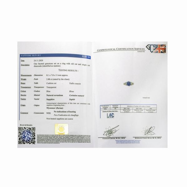 misura 9DESCRIZIONE: anello realizzato nella parte superiore con una doppia linea di diamanti taglio vecchio e huit huit al centro della quale è montato uno zaffiro taglio cuscino entro un castone traforato impreziosito con brillanti PESO: zaffiro ct 2.88, corredato da certificato gemmologico rilasciato dal Gemmological Certification Services London, n. 81287-99 rilasciato il 21/11/2020 che attesta che lo zaffiro, di provenienza Myanmar (Burma) non presenta tracce di riscaldamento, diamanti ct 0.30 circa, gr 3.6