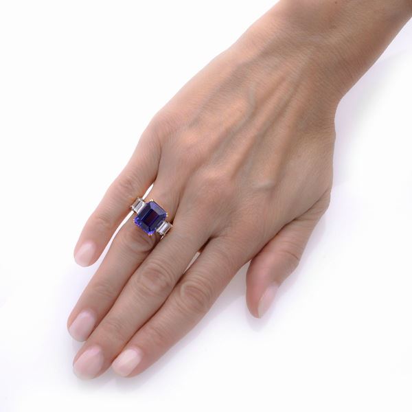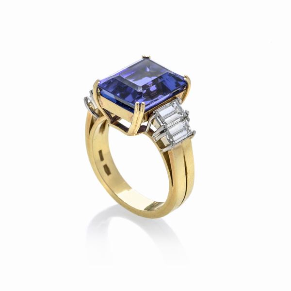 misura 14DESCRIZIONE: anello realizzato con tanzanite taglio rettangolare incorniciata con due diamanti taglio baguette per lato, reca il marchio 750 PESO: tanzanite ct 9.0 circa, diamanti ct 1.40, G-H, VS, gr 10.2