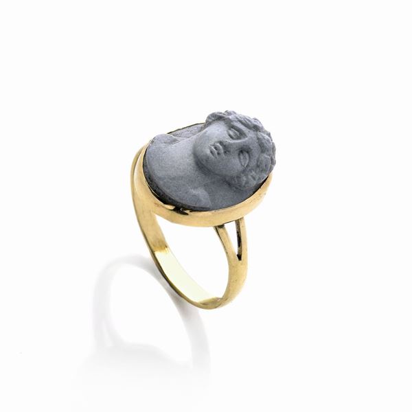anello 18DESCRIZIONE: anello realizzato con al centro da un cammeo in pietra dura intagliata ad altorilievo raffigurante una testa maschile PESO: gr 3.8