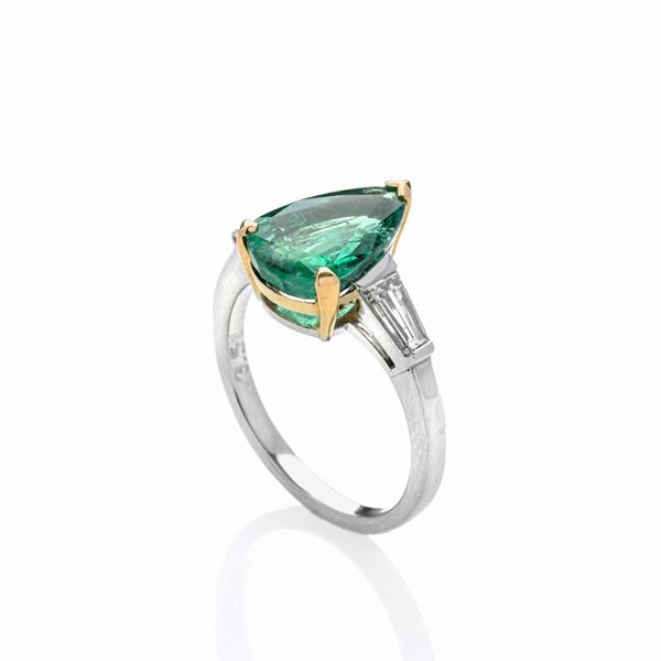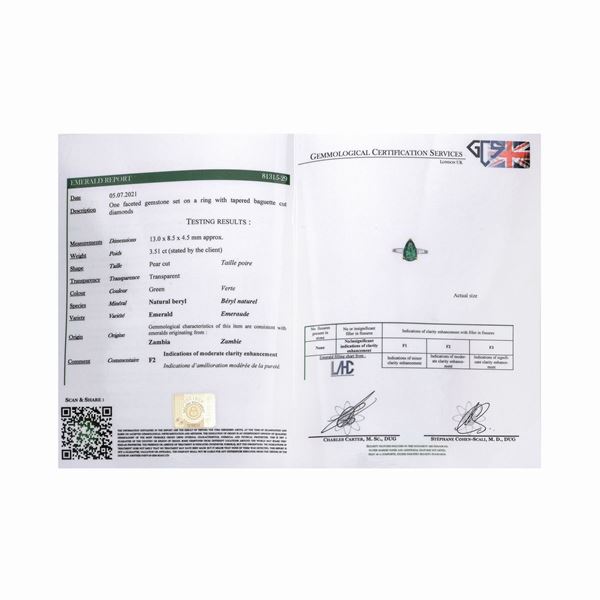 misura 18DESCRIZIONE: anello decorato da uno smeraldo taglio goccia montato entro castone a griffe in oro giallo affiancato da due diamanti taglio baguette, reca inciso all'interno della fascia la caratura dello smeraldo PESO: smeraldo ct 3.51, corredato di certificato gemmologico rilasciato dal Gemmological Certification Services n. 81315-29 del 5/7/2021 che attesta che lo smeraldo, di provenienza Zambia, mostra tracce di un moderato trattamento, diamanti ct 0.70 circa