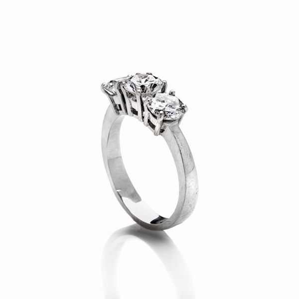 11DESCRIZIONE: anello trilogy realizzato con tre diamanti taglio brillante montati a griffe, reca il marchio 750 PESO: diamante ct 1.70 complessivi, G-H, VS, gr 4.2