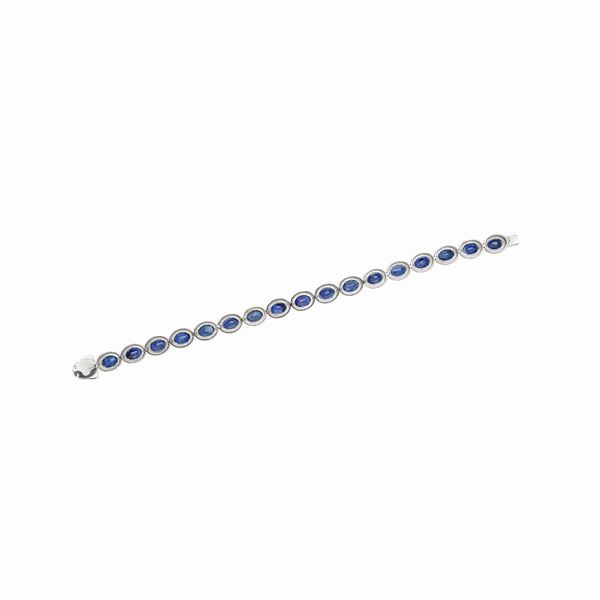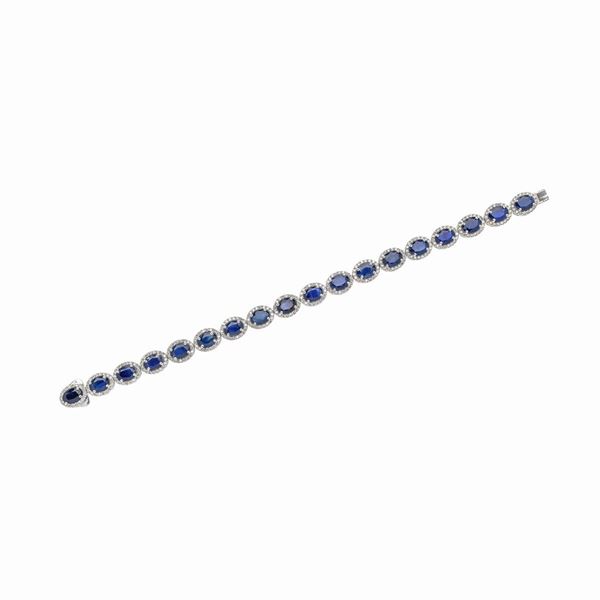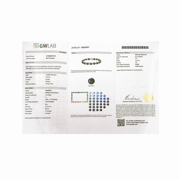 lunghezza cm 18DESCRIZIONE: bracciale realizzato ad una fila di diciotto zaffiri ovali di taglio misto montati entro castoni con cornice in diamanti taglio brillante, chiusura a scomparsa entro uno dei castoni PESO: zaffiri ct 18.55, diamanti colore F-H purezza VS1-SI2 ct 2.88, corredato di Certificato Gemmologico GW Lab n. 210000681018 del 12/10/2021, gr 17.3