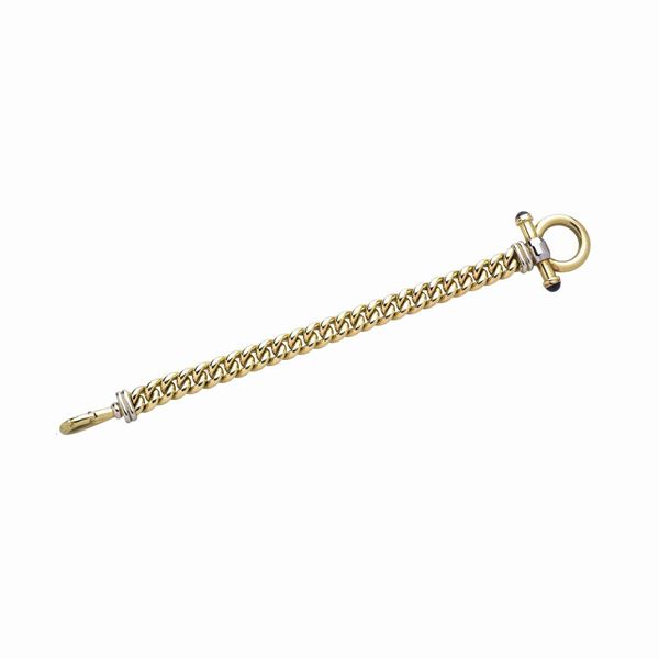 aperto lunghezza cm 21DESCRIZIONE: bracciale realizzato a maglia barbazzale con grande chiusura a staffa decorata alle estremità da quarzi cabochon, firmato Signoretti, reca punzone 750 PESO: gr 45.3