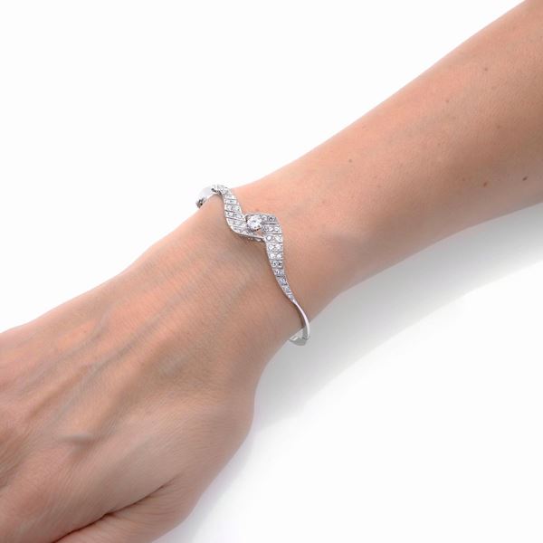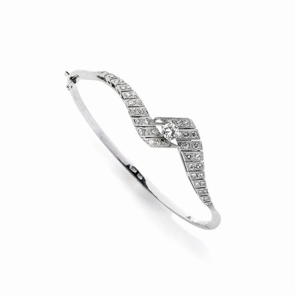 interno cm 5.8x4.8DESCRIZIONE: bracciale realizzato a cerchio rigido decorato nella parte superiore da due elementi contrapposti a volute interamente decorate con diamanti taglio huit-huit e centrato da un diamante taglio brillante, reca punzone 18K PESO diamante centrale ct 0.38, colore H, purezza SI, altri diamanti (taglio huit huit) ct 0.70, gr 14.2