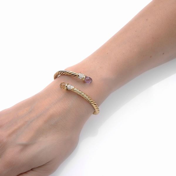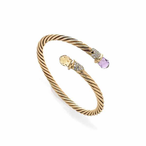 Bracciale rigido torchon in oro giallo 18k, diamanti, quarzo citrino ed ametista
