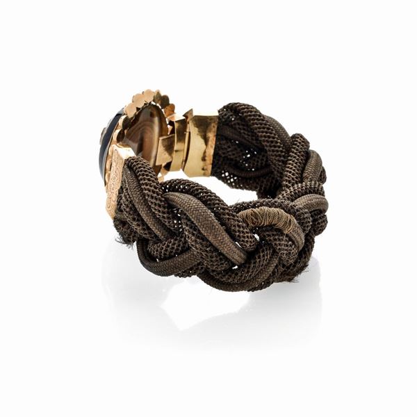 interno cm 5x4DESCRIZIONE: bracciale a fascia alta intrecciata, formata da capelli intessuti con lavorazioni diverse ed impreziosito da una grande fermatura realizzata con un cammeo ovale in agata intagliata a profilo femminile montato entro cornice in oro perlinato PESO: gr 26.3