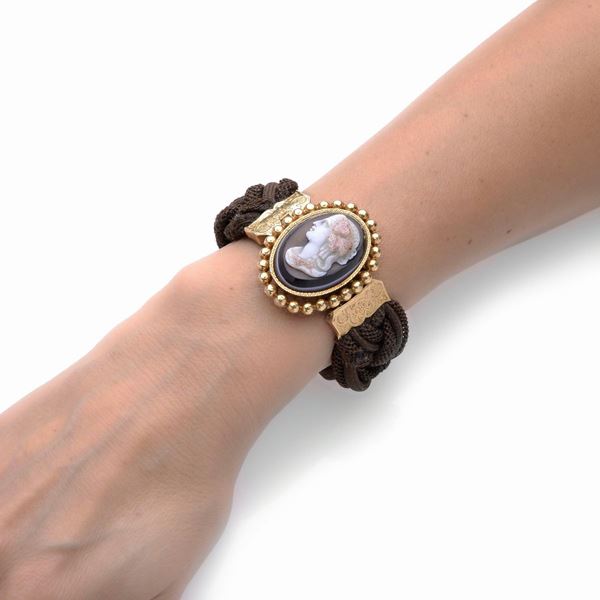 Bracciale Vittoriano commemorativo in oro giallo 18 kt, Cammeo in agata incisa e capelli