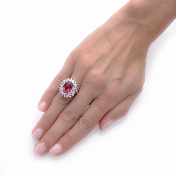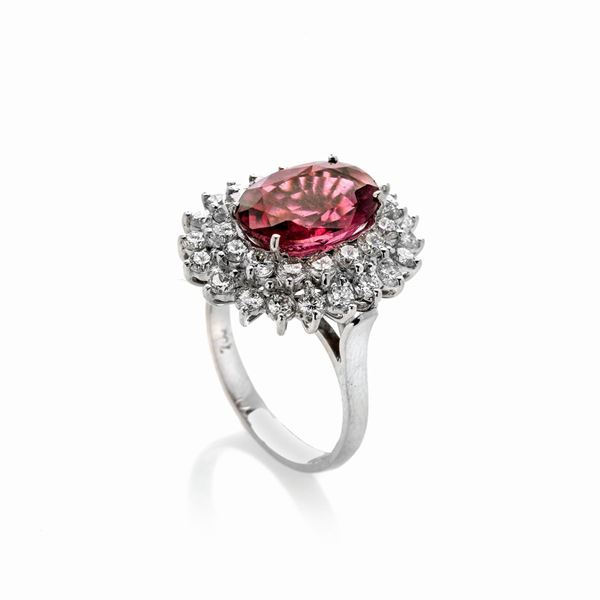 misura 17DESCRIZIONE: grande anello decorato al centro da una tormalina rosa di taglio ovale montata entro una cornice a due linee di diamanti taglio brillante, reca punzone 750 PESO: tormalina ct 5.0, diamanti ct 1.80, H, VS, gr 8.0