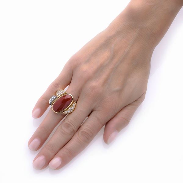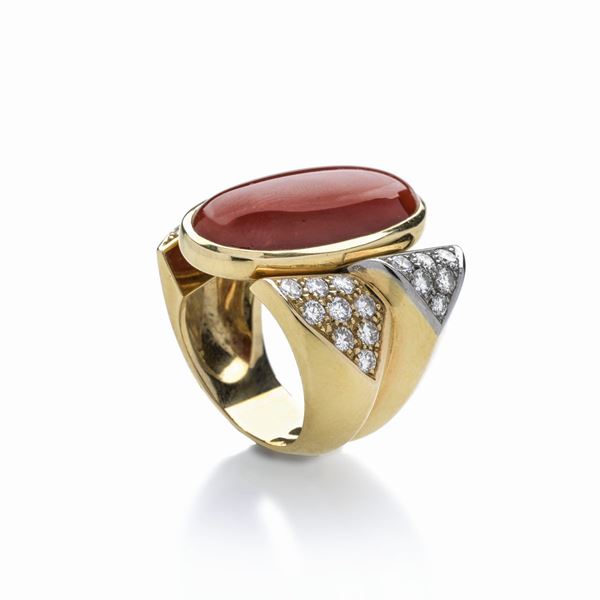 Grande anello in oro giallo 18k, oro bianco, diamanti e corallo rosso