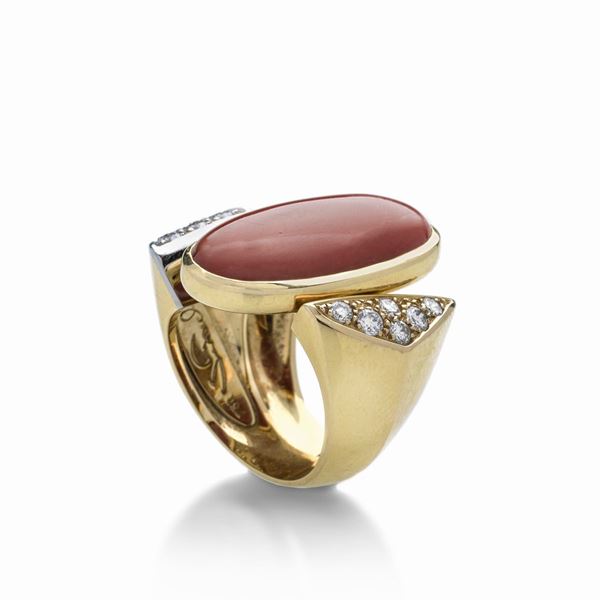 misura 16DESCRIZIONE: grande anello, di ispirazione geometrica, realizzato con corallo rosso taglio cabochon ovale impreziosito con pavè di diamanti, disposti su base triangolare, reca il marchio 750, firma di difficile lettura PESO: corallo ct 13, diamanti ct 0.90, G-H, VS-SI gr 25.9