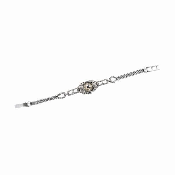 cassa mm 14x22, bracciale aperto cm 17.5DESCRIZIONE: di forma ottagonale allungata con fondello a scatto con cardine, lunetta e anse mobili traforate, cesellate ed impreziosite da rose di diamante QUADRANTE: avorio con numeri arabi e lancette traforate MOVIMENTO: a carica manuale BRACCIALE: di epoca posteriore, realizzato a due file di maglia a coda di topo, con marchi UnoAerre e 750 PESO: gr 20