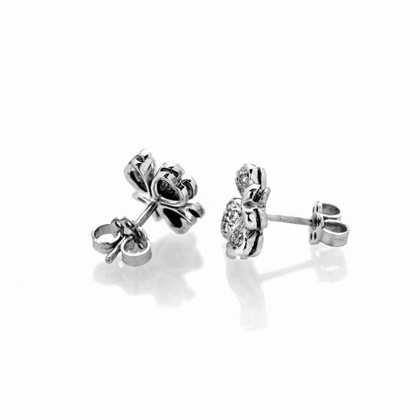 cm 1.1x1.1DESCRIZIONE: paio di orecchini a quadrifoglio, ciascuno interamente decorato da diamanti taglio brillante, le farfalline recano il punzone 750 PESO: diamanti ct 0.25, colore H-I, purezza VS, g 3.7