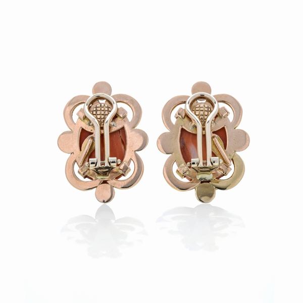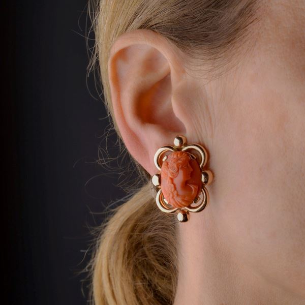 Paio di orecchini in oro giallo 18k e cammei in corallo rosso