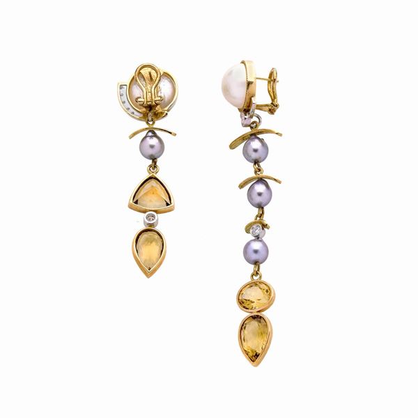 Paio di orecchini in oro giallo e bianco18k, perle mabè, quarzi citrini, diamanti e perle grigie