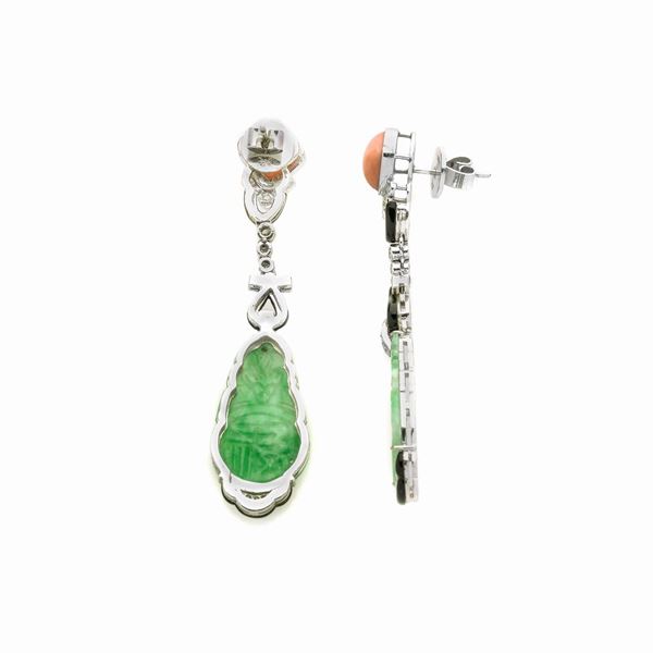 Paio di orecchini pendenti in oro bianco 18k, corallo rosa, diamanti, onice e giadeite