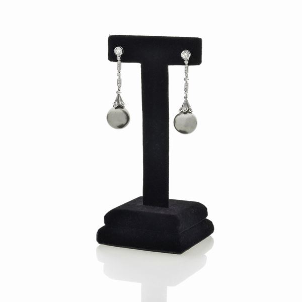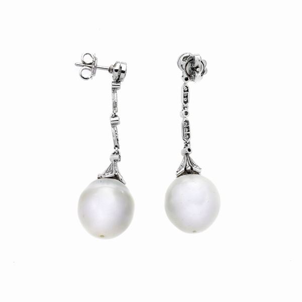 lunghezza cm 5DESCRIZIONE: paio di orecchini pendenti ciascuno realizzato con un diamante taglio brillante a cui è sospesa una linea formata da due barrette intercalate da brillanti con finale modellato a cono rovesciato, anch'esso decorato in brillanti, che funge da montatura su cui possono essere alternate una perla australiana bianca ed una grigia PESO: diamanti ct 1 circa, perle bianche mm 16x15, perle grigie diametro mm14.1, gr 23.6