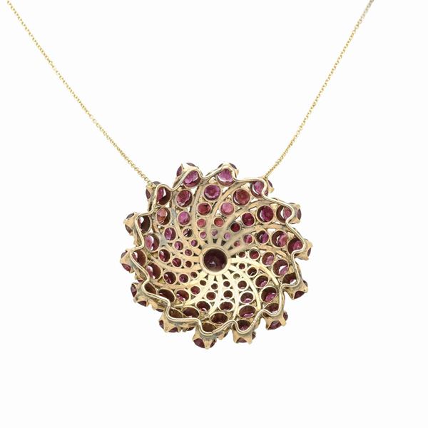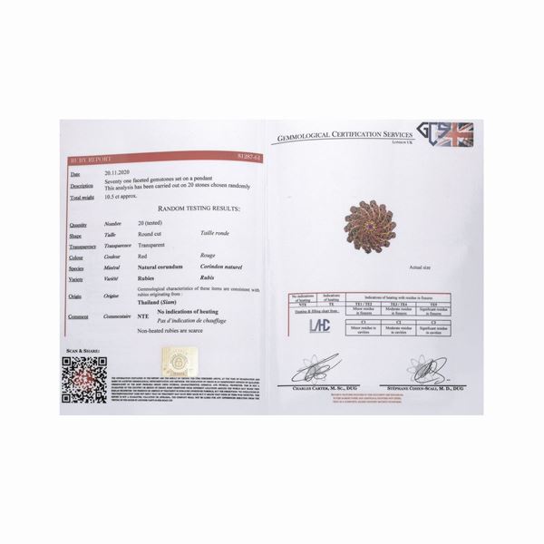 lunghezza aperta cm 41, diametro pendente cm 36DESCRIZIONE: il pendente, realizzato come una corolla stilizzata interamente decorata con rubini taglio rotondo, è montato al centro di una catena a maglia sottile recante marchio 750 PESO: rubini ct 10.5 circa, il pendente è corredato di certificato gemmologico rilasciato dal Gemmological Certification Services London n. 81287-61 il 20/11/2020 eseguito su 20 rubini scelti casualmente dei quali si attesta la provenienza Tailandia e l'assenza di tracce di riscaldamento, gr 12.6