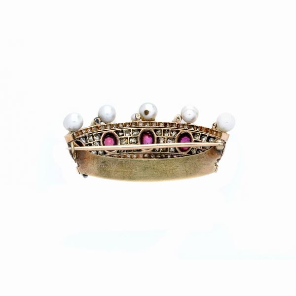 lunghezza cm 4.2, h cm 2DESCRIZIONE: spilla modellata come una corona, la fascia interamente decorata da un pavè di diamanti taglio vecchio e rose entro cui si intercalano quattro rubini di taglio vecchio e microperle, sommità decorata da cinque perle PESO: perle diametro mm 5, diamanti ct 1.0 circa, rubini ct 1.50, gr 9.8