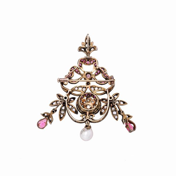 cm 4.5 x 7 hDESCRIZIONE: Spilla pendente, di ispirazione floreale, realizzata come un fiocco che sorregge un cartiglio traforato a corolle stilizzate e volute, con perla scaramazza pendente tra due boccioli, la spilla è interamente impreziosita con rubini e rose di diamante PESO: rubini ct 2.40, diamanti ct 1.30, gr 17.8