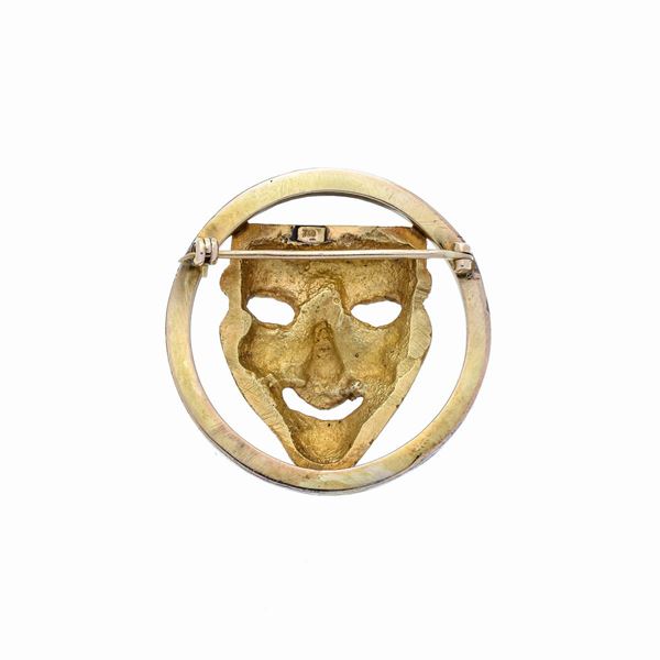 diametro cm 3.8DESCRIZIONE: spilla realizzata come una maschera modellata ad alto rilievo con occhi e bocca traforati e montata entro cornice circolare, reca il marchio 750 PESO: gr 27.5