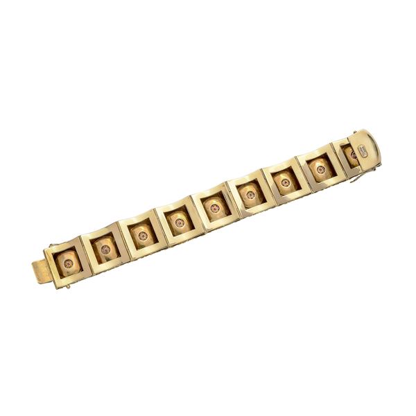 Aperto lunghezza cm 19Alto bracciale in oro giallo e rubini, reca il marchio 750, gr 73.1