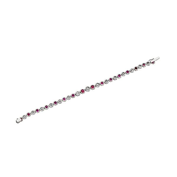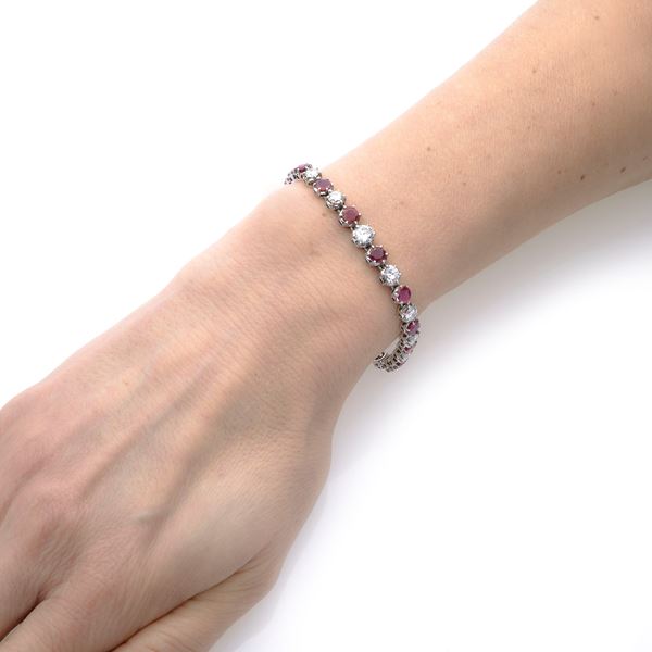 aperto lunghezza cm 18Bracciale tennis con sedici diamanti taglio brillante leggermente degradè per ct 4.30 circa, colore G-H, SI e sedici rubini taglio rotondo per ct 3.60 circa, gr 15