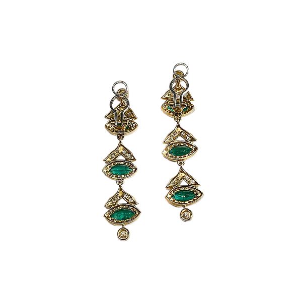 Lunghi orecchini pendenti in oro giallo, diamanti e smeraldi