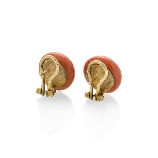 diametro cm 1.5Orecchini con corallo di taglio cabochon rotondo con diametro di cm 1.5, recano il marchio 750, gr 11.1