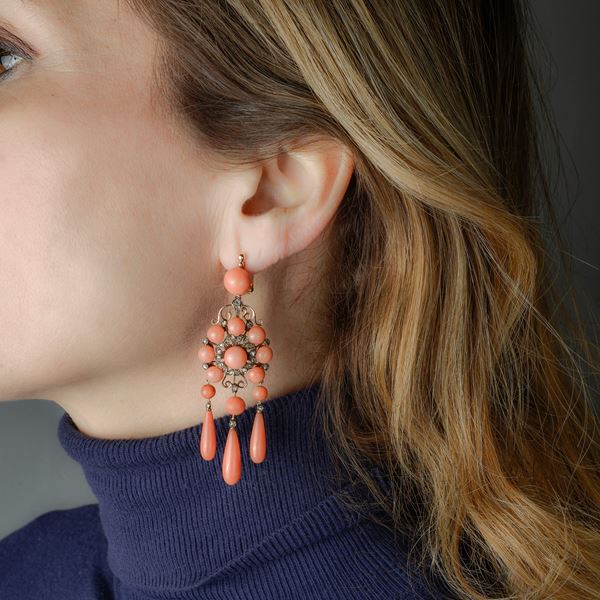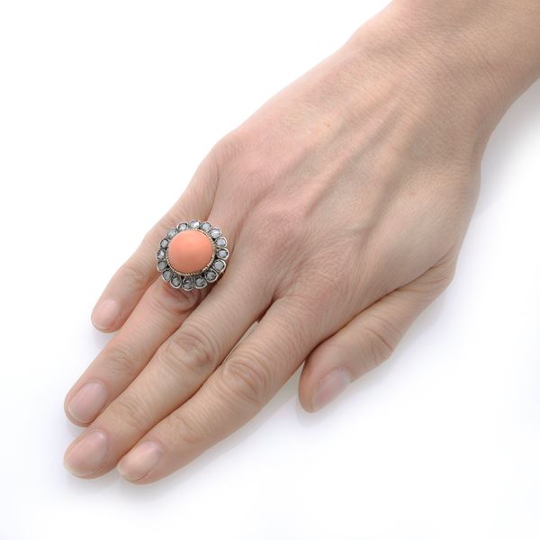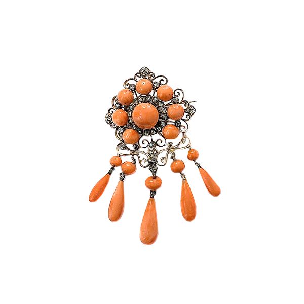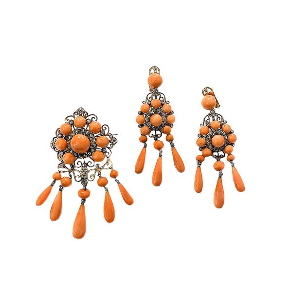 Orecchini cm 2.5 x 7h, spilla cm 4 x 7.6 h, anello MISURA 14Paio di orecchini pendenti, di ispirazione floreale, ciascuno realizzata con corallo rosa taglio cabochon e goccia e rose di diamante per ct 0.50 circa, clip di epoca posteriore, grande spilla pendente en suite, con rose di diamanti per ct 1.0 circa e anello a margherita con corallo rosa taglio cabochon e rose di diamante per ct 1.0 circa, orecchini gr 20.6, spilla pendente gr 19.5, anello gr 11.3