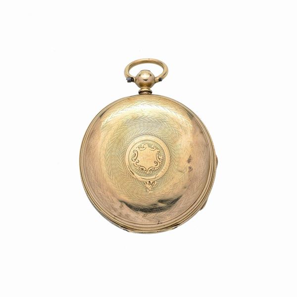 diametro mm 35CASSA: incisa a guilloche, anello a ore 12, apertura per la chiavetta sul fondello interno, reca marchi inglesi dell'oro 18 k , la cassa presenta alcune ammaccature QUADRANTE: oro guilloche con numeri romani, una lancetta danneggiata MOVIMENTO: con carica a chiavetta, da revisionare, mancante della chiavetta, gr 39.2