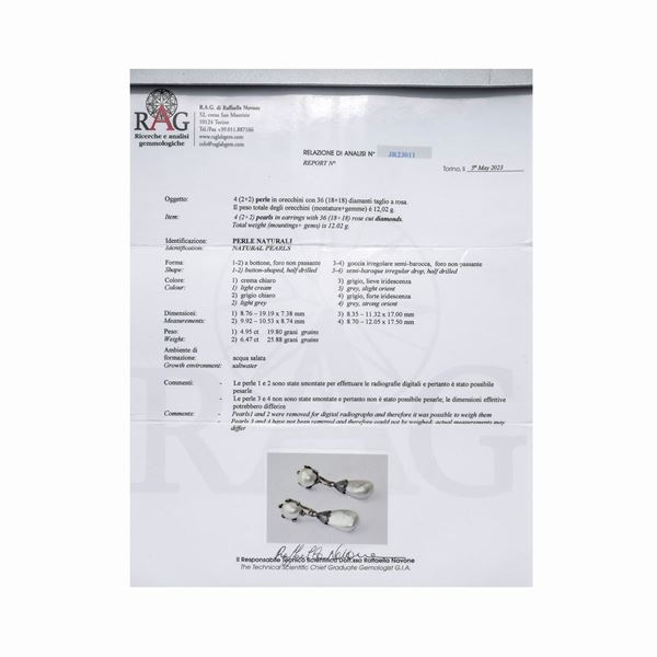 cm 4 hPaio di orecchini pendenti in oro 14 kt con quattro perle naturali, due a bottone e due a goccia irregolare semi-barocca, le quattro perle sono corredate di certificato R.A.G. num. JR23011 del 5.05.2023, gr 12