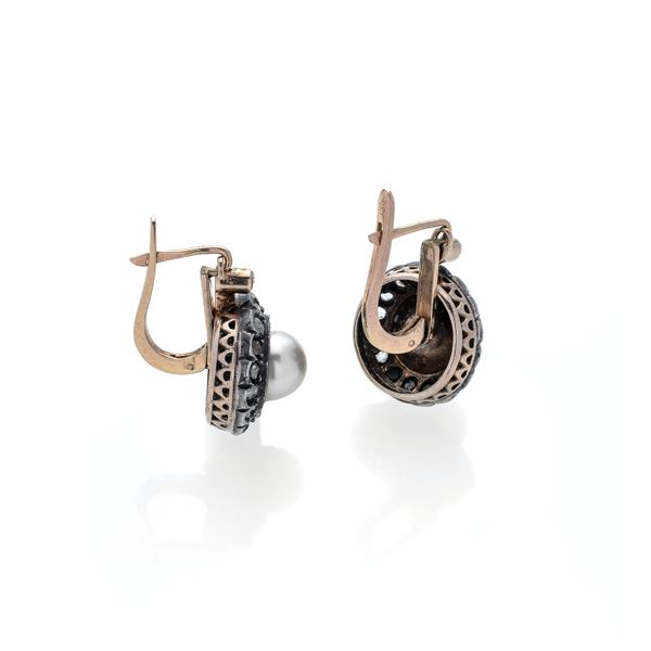 Diametro cm 1.6, cm 2 hPaio di orecchini pendenti a margherita con rose di diamanti per ct 0.50 circa e perle di mm 8, recano il marchio 500, gr 12.0