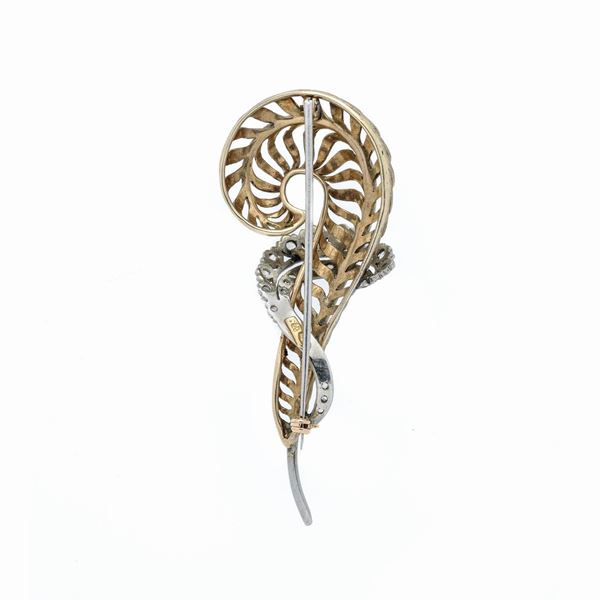 cm 3 x 7 hSpilla realizzata come una grande piuma, a tricot, con rose di diamante per ct 0.35, reca il marchio 750, gr 14.4